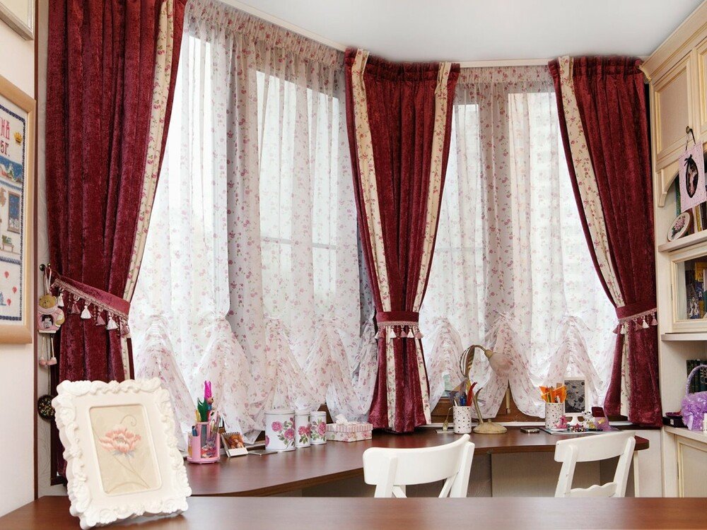 Австрийская штора вельвет бордовый, карниз верёвочный